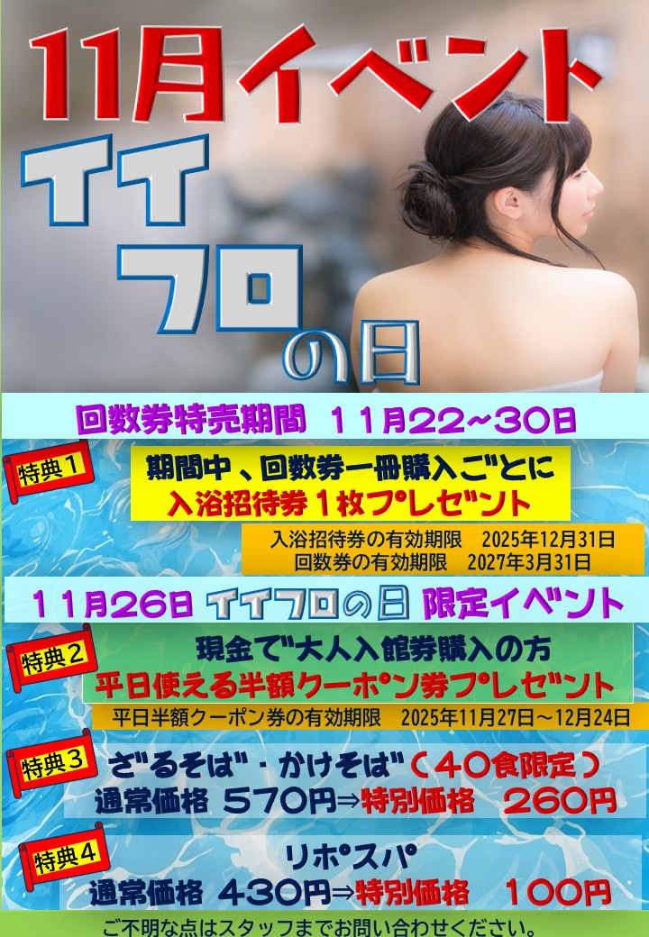 入浴回数券特売!今月は22日から月末まで! 11月26日は”イイフロの日”!
