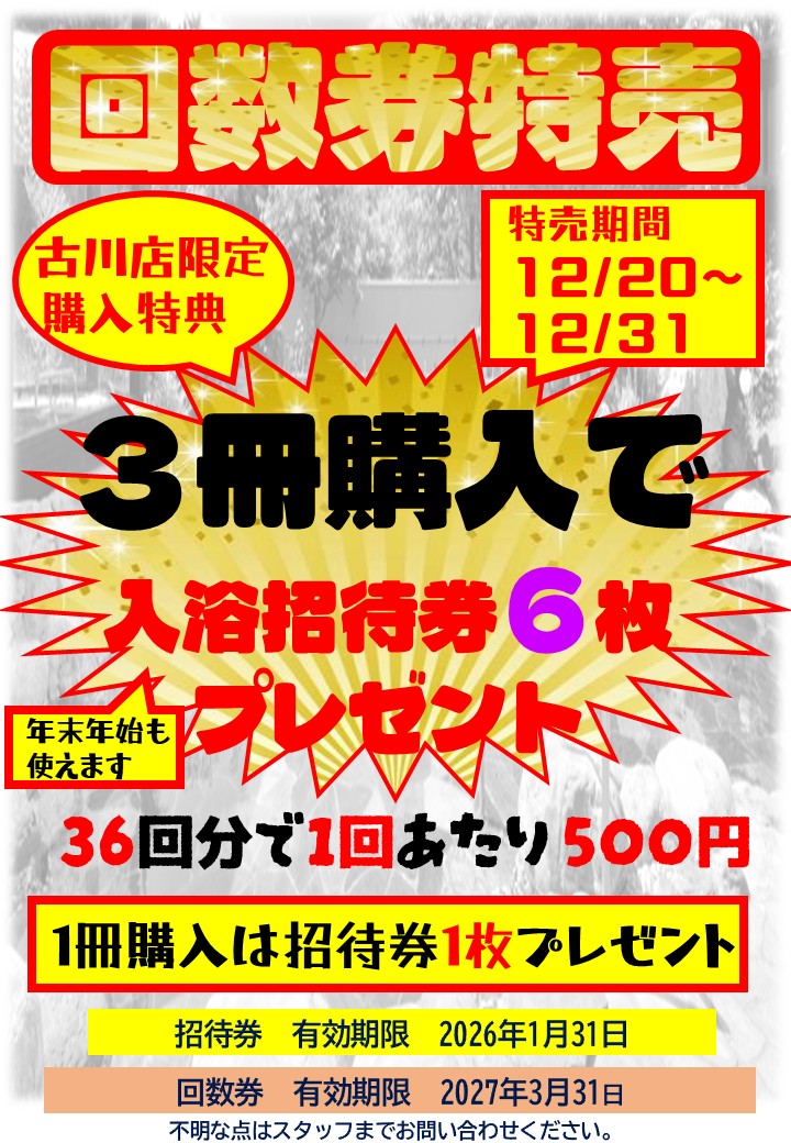 入浴回数券特売!今月は20日から月末まで! 3冊購入すると入浴招待券6枚プレゼント!