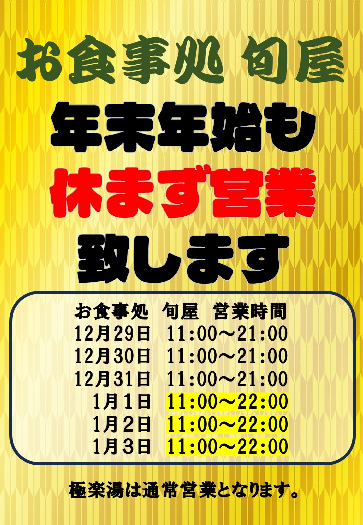 お食事処 旬屋 年末年始の営業時間のお知らせ